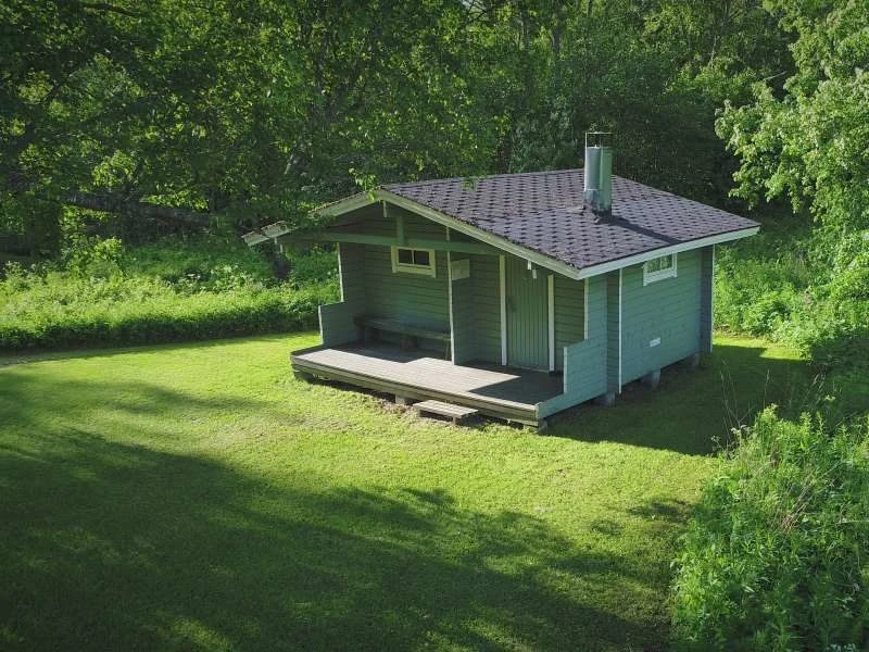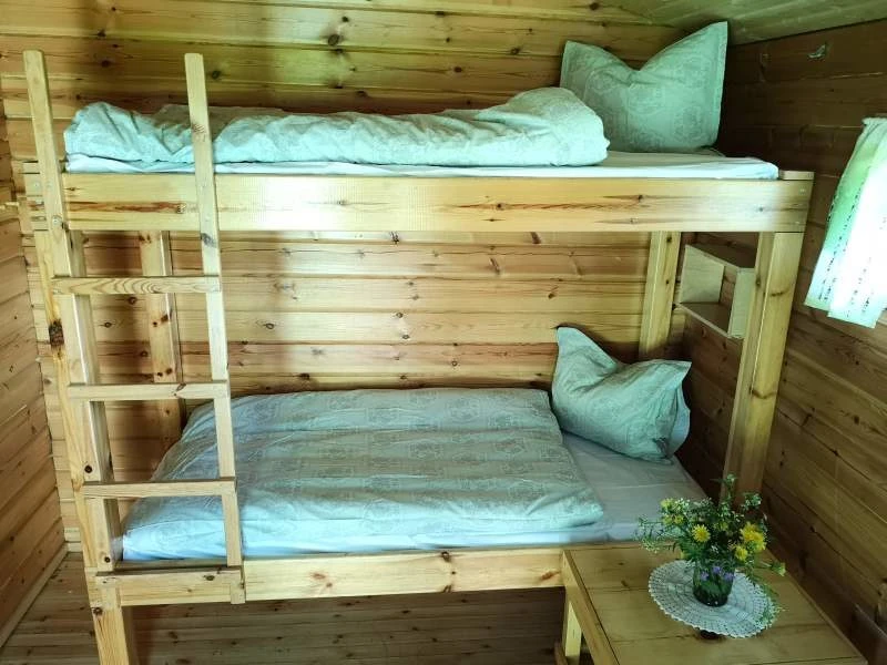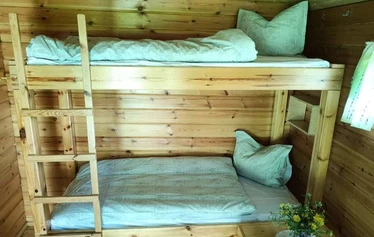 Mökki on hirsinen leirimökki, jossa kolme kerros-sänkyä. Muukonsaaren päärakennukessa yhteinen keittiö käytettävissä.